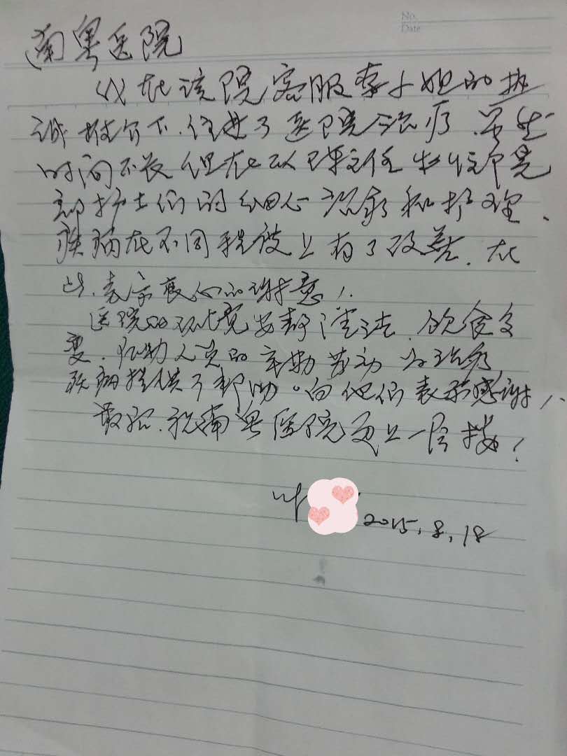 护士长打开看后也欣慰的笑了,瞬间由忧到喜,原来这位居住番禺侨联社区新城区72岁的阿姨在出院前,亲笔给广州南粤医院写了封情真意切的感谢信。
