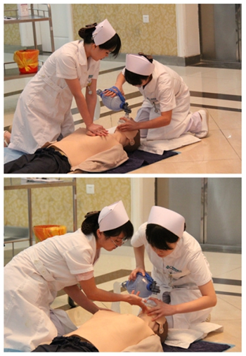 参加心肺复苏比赛的护士被两两分成一组,依次进行急救操作。“简易呼吸气囊、纱布、免洗洗手液、护理记录单、笔、医疗垃圾桶······”确认急救设施齐备后,一名护士快速冲向躺在地上的模型人,一边拍打“患者”并对着患者的双耳呼喊,当发现患者无反应、无意识后,立即通知另一名护士做好抢救准备。两位护士将患者置于地面平躺,并解开他的衣领和腰带,露出患者的胸和腹部,进行心脏按压,在连接进行三组简易呼吸气囊呼吸等抢救操作后,患者被成功施救复苏,最后,护理人员帮助患者整理衣裤等,并严格洗手步骤后详细记录了抢救的时间及经过。整个抢救过程十分流畅,参赛护士动作规范、技术娴熟、严格按照操作流程,一丝不苟,获得了评委老师的赞许。