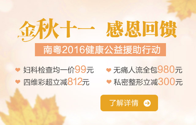 值国庆节来临之际,广州南粤医院庆贺新中国建立67周年之余,为感谢广大市民对南粤一直以来的支持和信赖,隆重举办“金秋十一·感恩回馈——南粤2016健康公益援助行动”活动,通过检查优惠、手术援助、医师亲诊等公益援助行动,感恩回馈每位市民,让市民重获健康的同时减轻家庭经济负担。