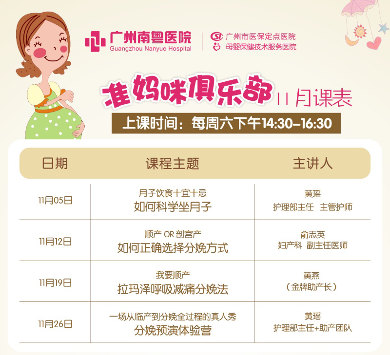 准妈咪们,您们想知道如何才能科学坐月子吗?想知道如何正确选择分娩方式吗?想了解拉玛泽呼吸减痛分娩法吗?想参加分娩预演体验营吗?这个11月,广州南粤医院准妈咪俱乐部将会与准妈咪们一起分享这些孕育知识,减少准妈咪们对孕育疑惑。还等什么?赶快报名吧!