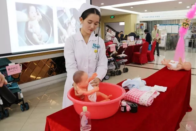 由熊少芳讲解婴儿洗澡和抚触的好处以及注意事项,卢昆育护士现场示范。