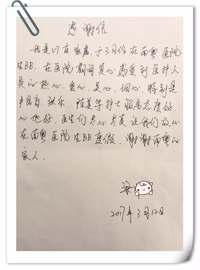 3月10日晚上,高女士出现临产征兆,当天晚上便顺利在南粤医院产下宝宝。从入院,到分娩,到入住产科住院部,短短数日,广州南粤医院产科医护团队热情、细致、专业的服务,让高女士夫妇深感满意和感动。感性的梁先生遂执笔写下一封感谢信。全文如下: