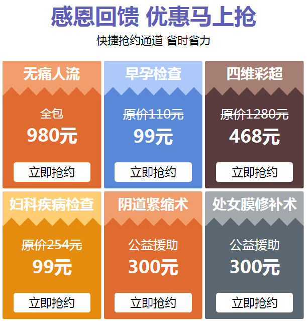 近期,为回馈广大市民的信赖,开展了妇科优惠季,推出多种检查和治疗套餐优惠(如下图所示),其中包括无痛人流全包价980元等多项优惠,先到先得,立刻点击下方图片领取!